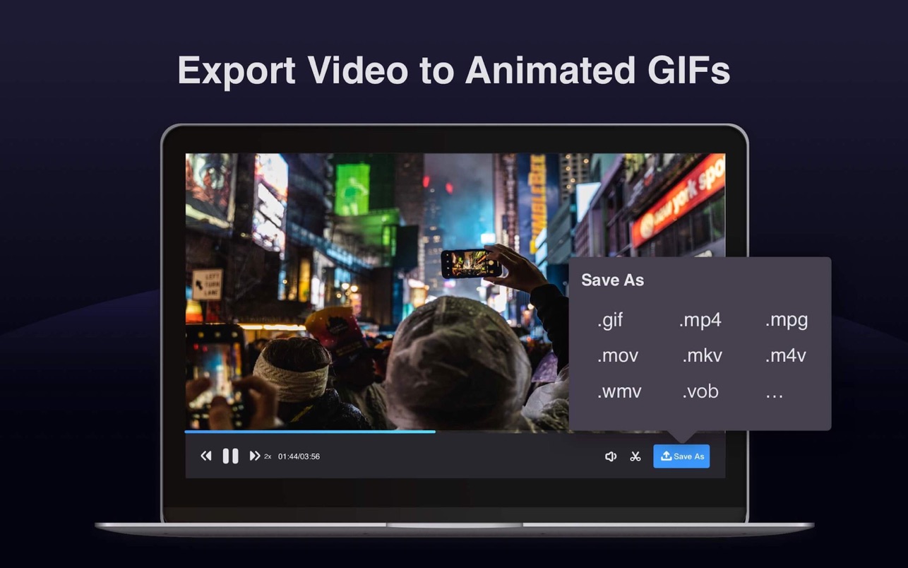 Filmage Screen视频转换器支持您将任何视频转换MP4,Apple ProRes,MOV,3GP,VOB,MKV,M4V,WMV,AVI,MPG,FLV,F4V,SWF,TS等多种视频格式。 Filmage Screen还是GIF动画制作器,可让您将视频导出为GIF动画。 Filmage Screen也可以是媒体播放器。只需将视频或电影拖动到app上,它将成为您专属播放器。