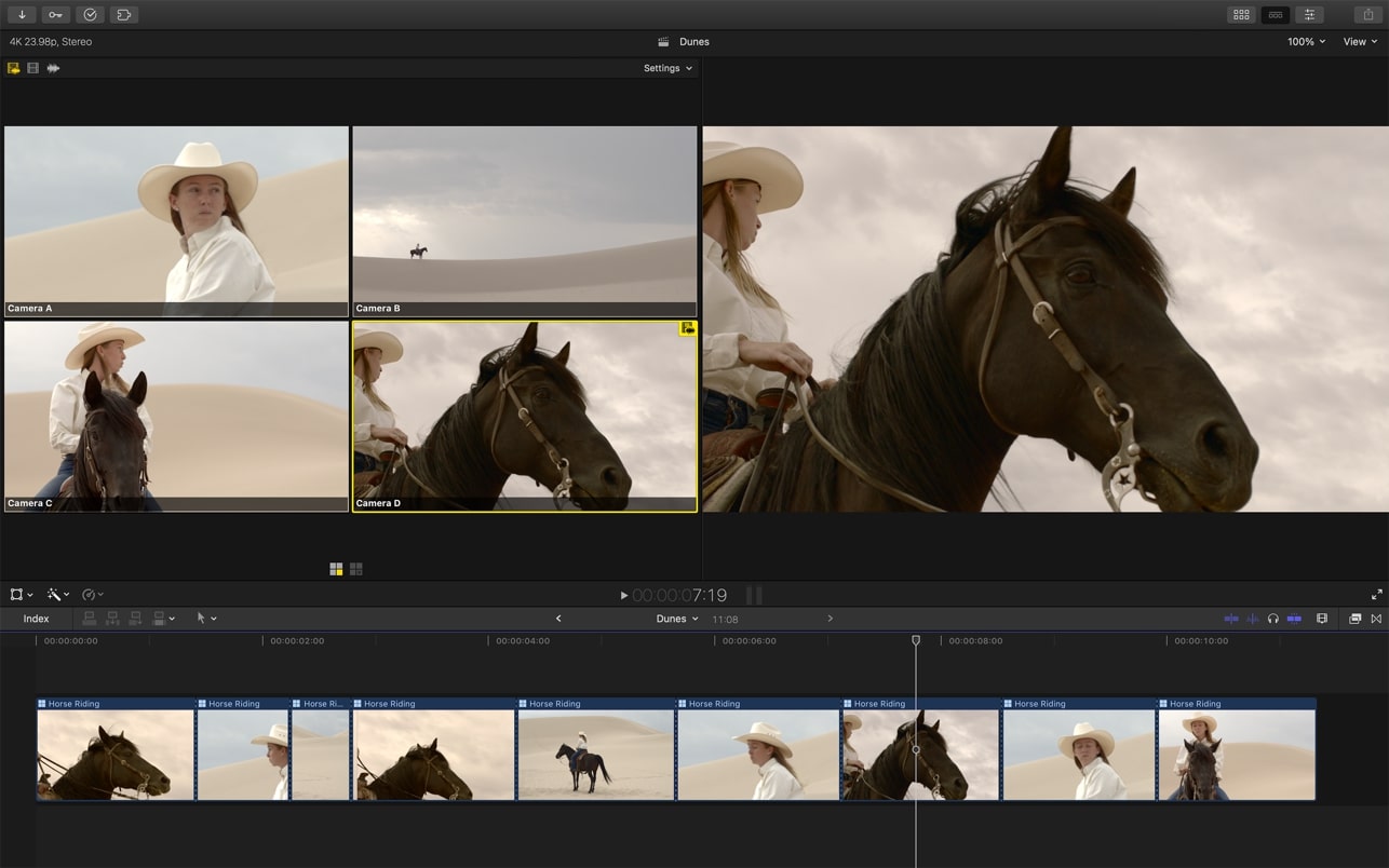 通过自动同步编辑多机位项目并支持多达 64 个摄像机角度