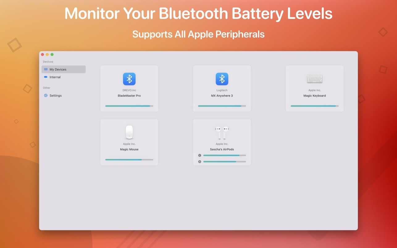 Magic Battery 在菜单栏中显示支持的输入设备和蓝牙连接耳机的电池电量。还支持内置电池。
