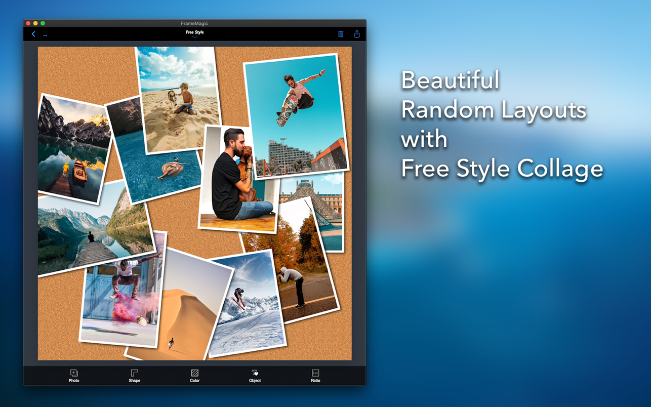 FrameMagic 还支持强大而智能的照片编辑器,包括物体去除、柔肤、暗光、散景、贴纸、剪影、轮廓、孔、背景模糊、运动模糊和颜色飞溅。