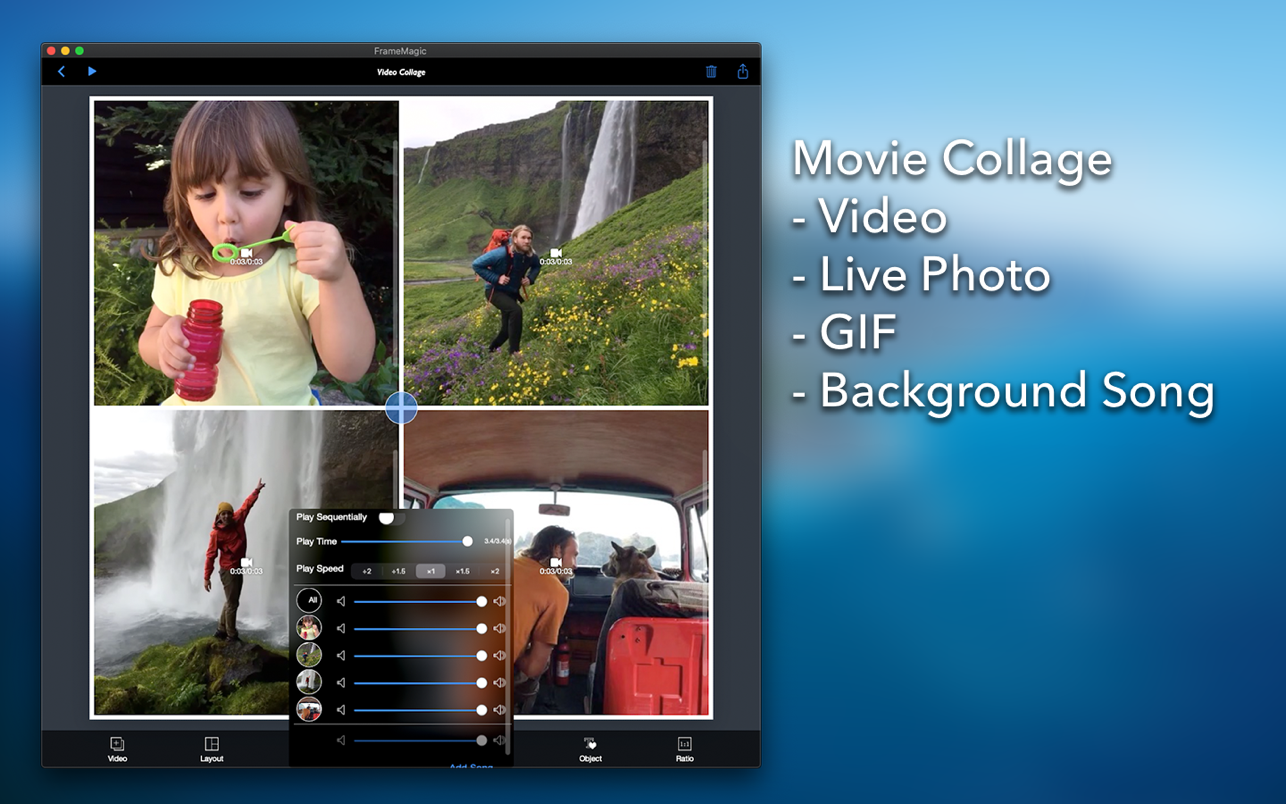 FrameMagic 使您能够在几秒钟内创建令人敬畏的照片拼贴、视频拼贴和视频幻灯片,其中包含大量布局、无穷无尽的选项、颜色、图案、强大的文本编辑器、漂亮的滤镜效果、灵活的播放选项、音乐和旁白。