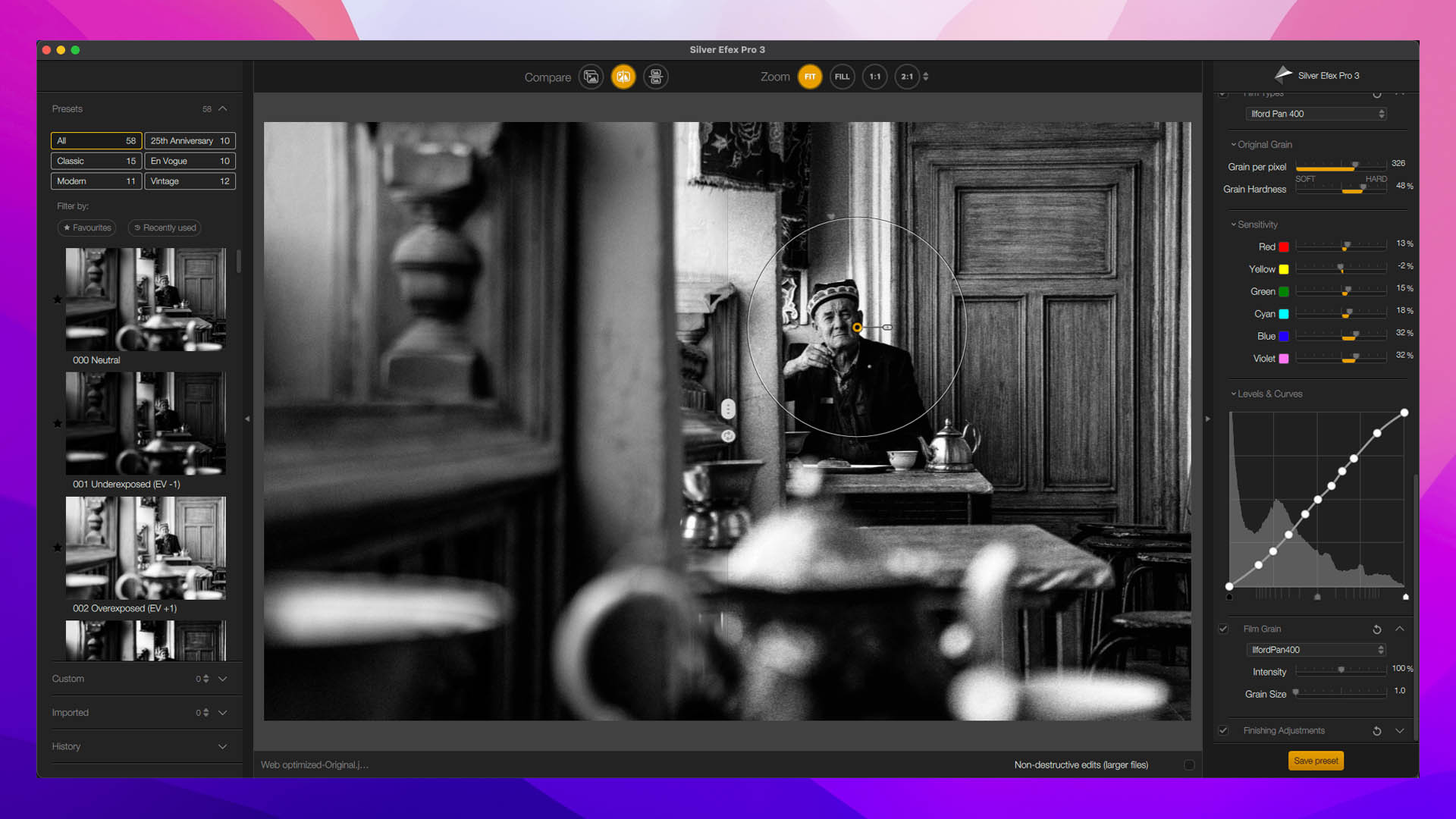 Silver Efex Pro可以对亮度,柔和的对比度,白色水平进行超微调,并具有先进的颗粒引擎,可以准确再现过去几年中最具标志性的黑白胶片类型的经典外观。