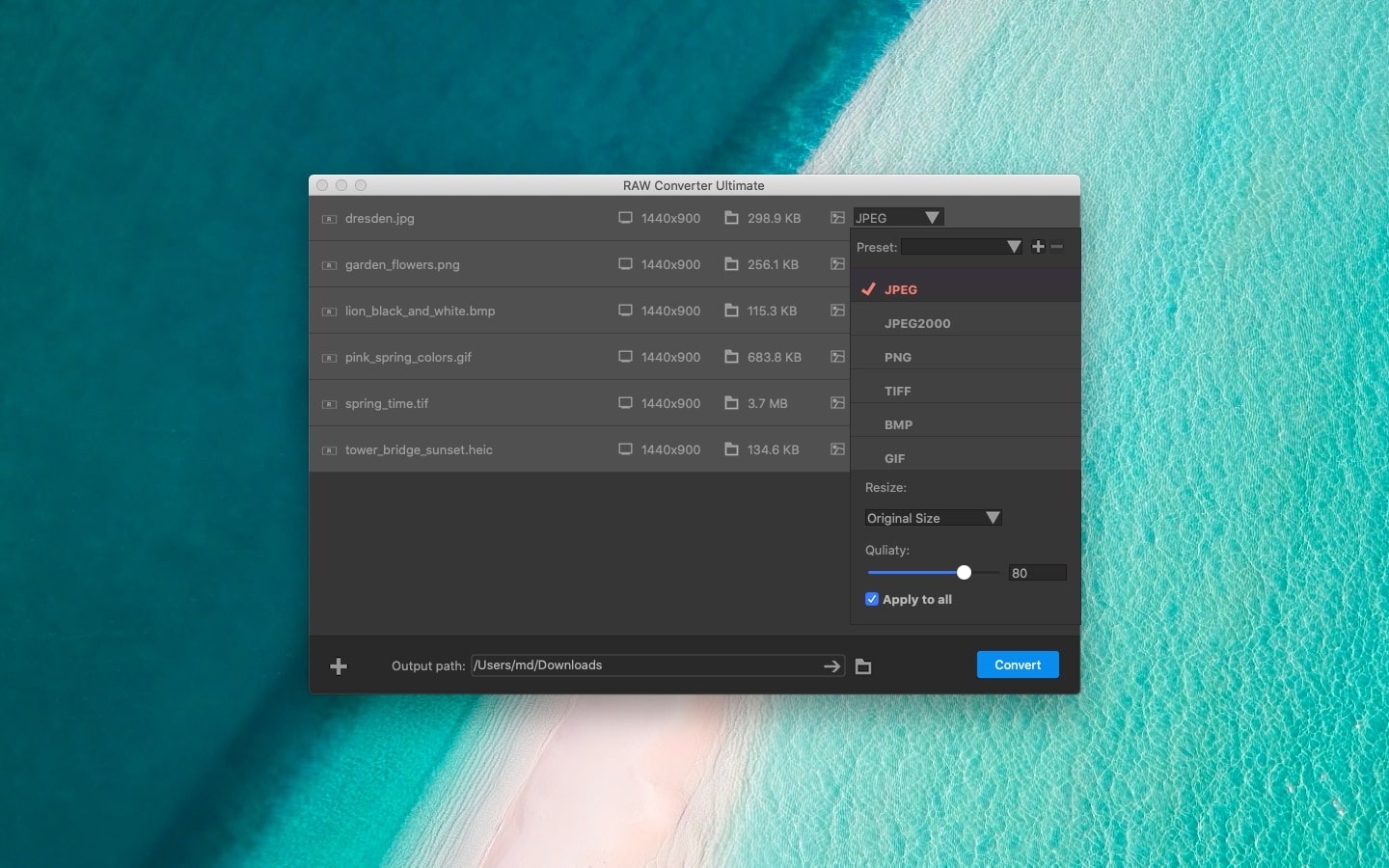设置图像导出格式时,RAW Converter 提供 6 种格式、5 种预设图像调整大小选项和自定义图像大小。用户还可以自由调整图像存储质量。这些功能可以一键应用到界面中的所有文件,非常简单快捷。
