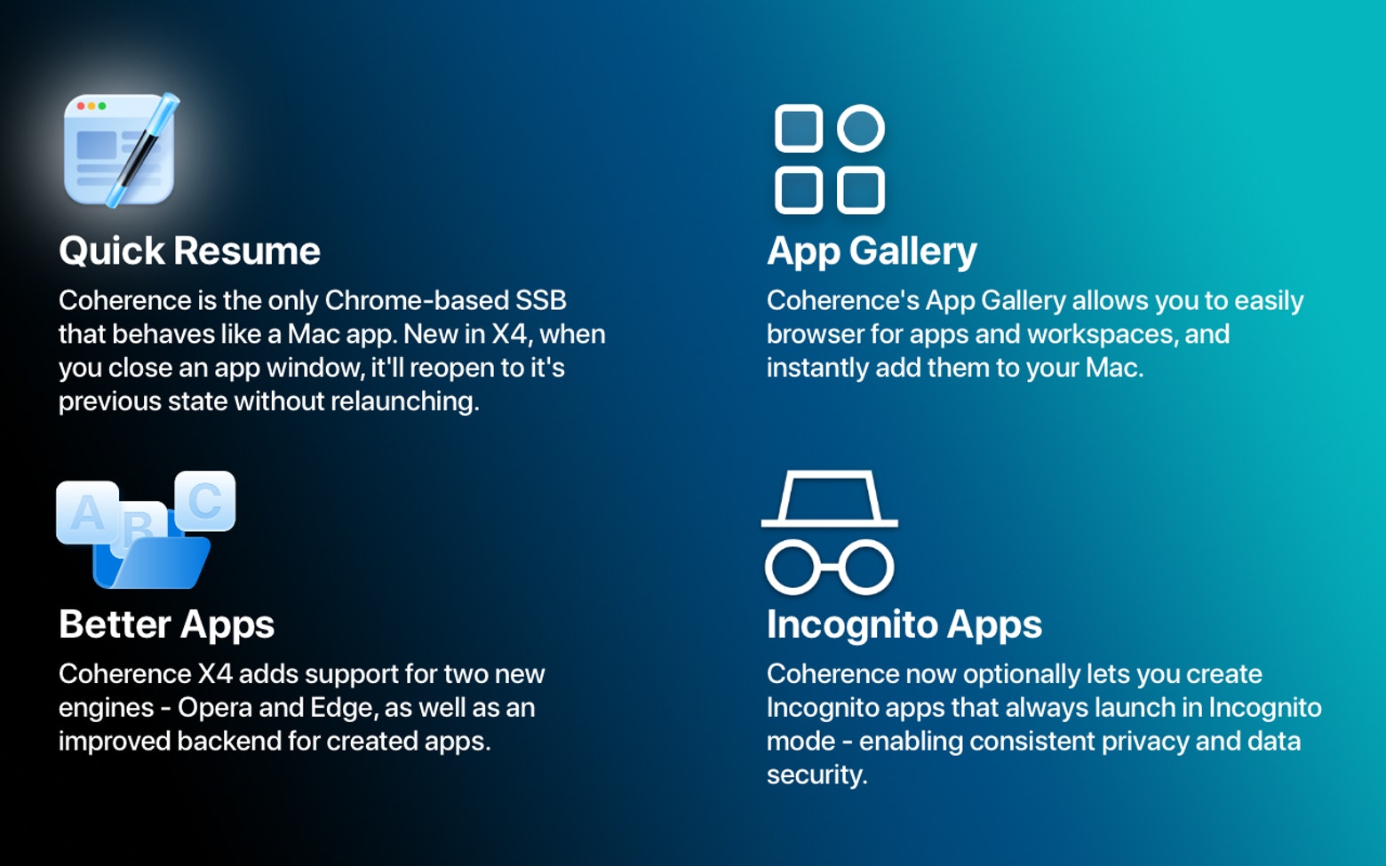 使用Chrome作为引擎,Coherence Pro允许您使用Chrome的优势,例如金丝雀或Spotify的网络播放器,并创建完全独立的应用程序。如果需要多个程序,则可以通过在应用程序之间传输设置来批量创建程序。