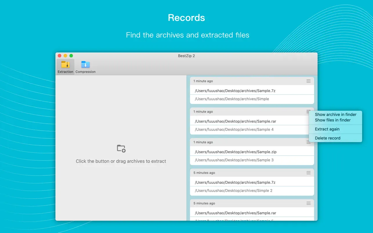 您可以拖动文件到“解优 2”图标进行解压,也可以设置“解优 2”为压缩包的默认打开方式后鼠标双击进行解压。