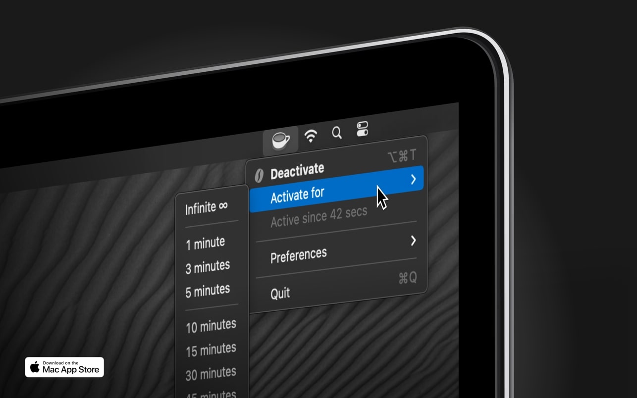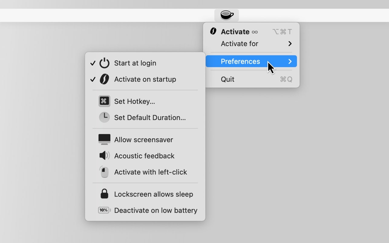 只需单击菜单栏图标或定义自定义全局热键,即可在 Mac 上制作咖啡因。它速度快、重量轻,可与 macOS 10.12 及更高版本完美搭配。