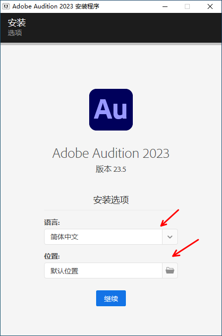 3、自定义安装位置,选择语言,点击继续(如下图)
