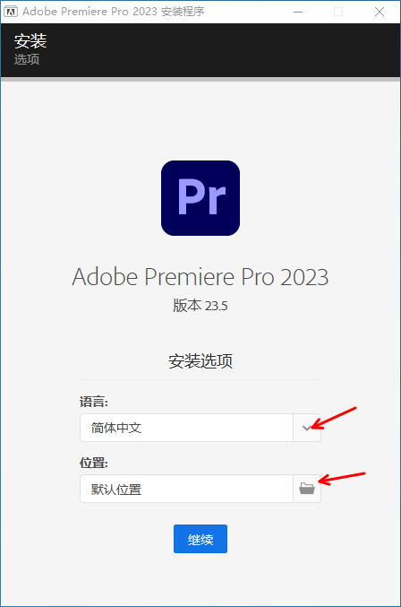 3、自定义安装位置,选择语言,点击继续(如下图)