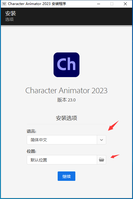 3、自定义安装位置,选择语言,点击继续(如下图)