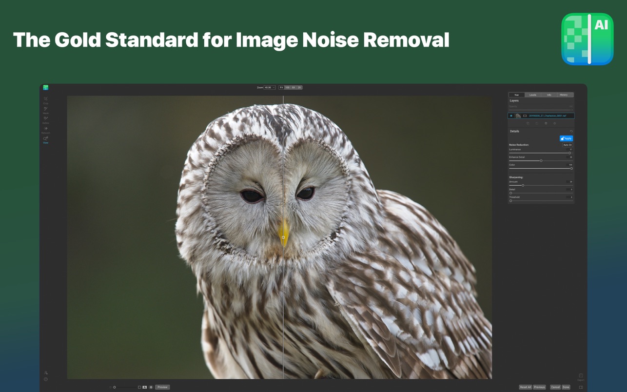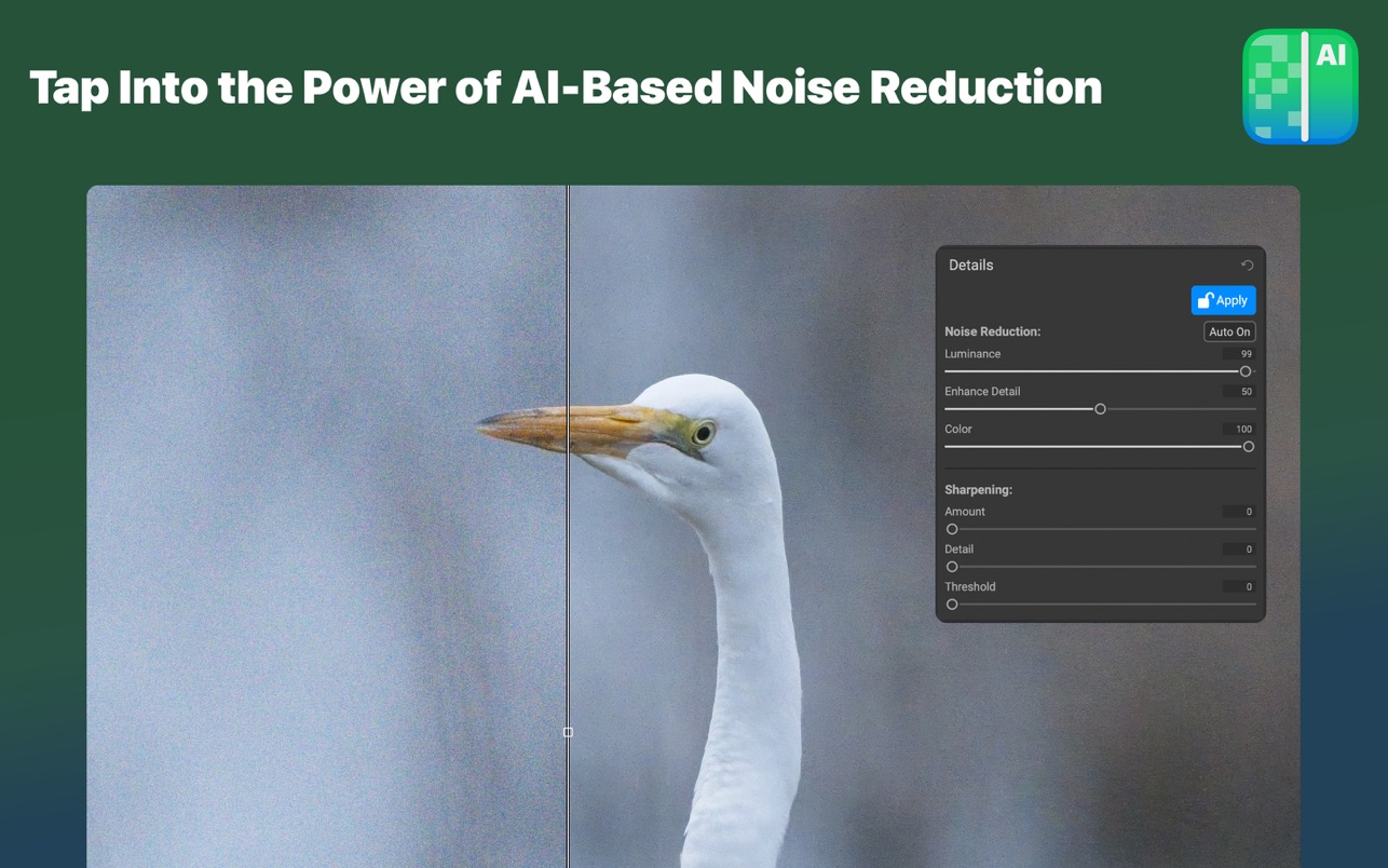 利用最先进的机器学习来构建 AI 网络,以消除亮度和颜色噪声,同时保持细节,这是其他应用程序无法产生的出色结果。