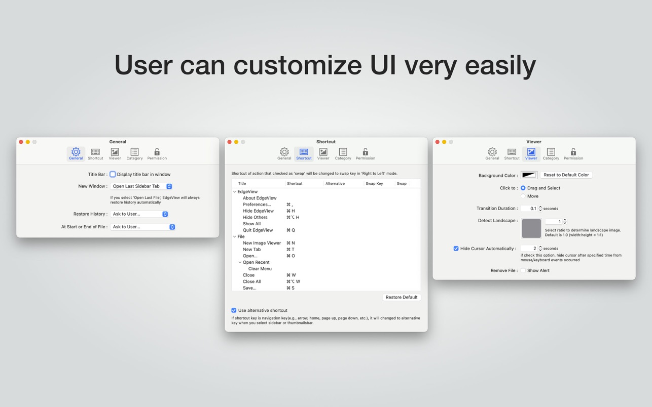 用户可以使用键盘快捷键、鼠标滚轮、触控板手势快速浏览图像。EdgeVew 显示 EXIF 信息,流畅播放动画 GIF/PNG/WebP。将上次状态保存到历史记录,并在重新打开文件时恢复。