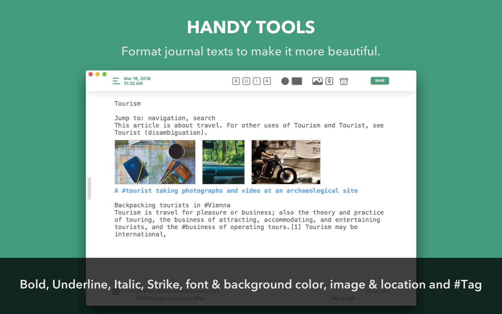 用文本格式工具装饰你的日记,使其更加真实。所有这些工具将始终可用在垂直放置在左侧栏上的日记帐窗口旁边。大胆,强调,斜体,删除文本通过您的期刊表达不同的感受。您还可以通过在同一左侧栏中预先定义的颜色托盘,轻松更改文本颜色和文本背景颜色。