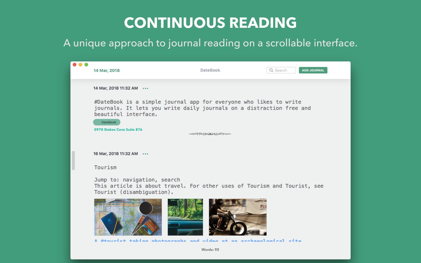 喜欢写日记的人来说,DateBook for Mac是一个简单的日记应用程序。它可以让你写一个美观的界面日常日记。它可以保存所有日志,包括日期,时间,字数等信息,并将其显示在一个美观的界面上,您可以一次查看所有日记条目。