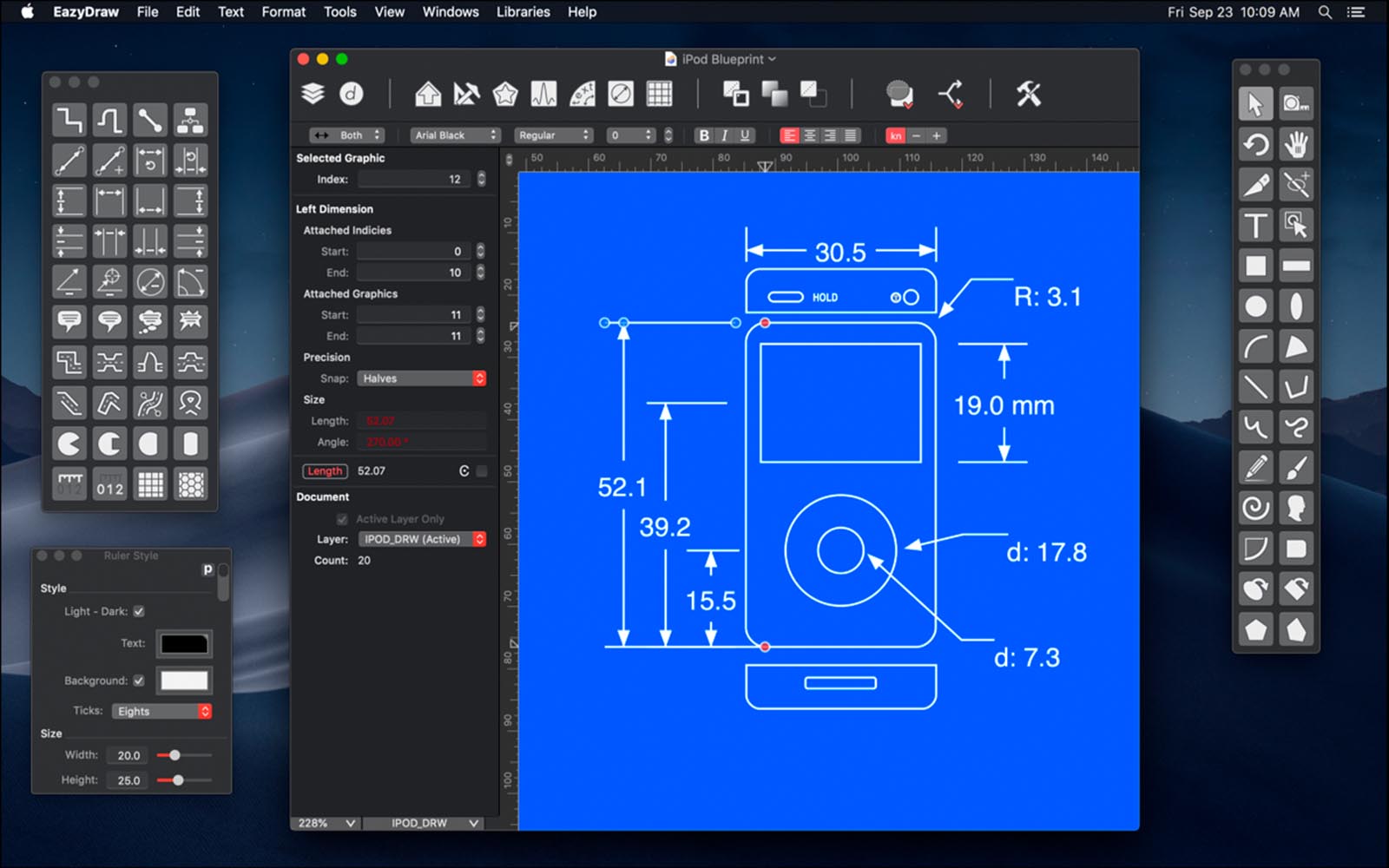 EazyDraw提供了一个平衡的功能集,包括技术绘图、网络和应用程序的图形设计、印刷出版、标志、页面-文本布局等所需的工具。对每个人来说都足够简单,但又有你的项目所需的深度。