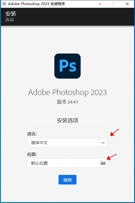 3、自定义安装位置,选择语言,点击继续(如下图)