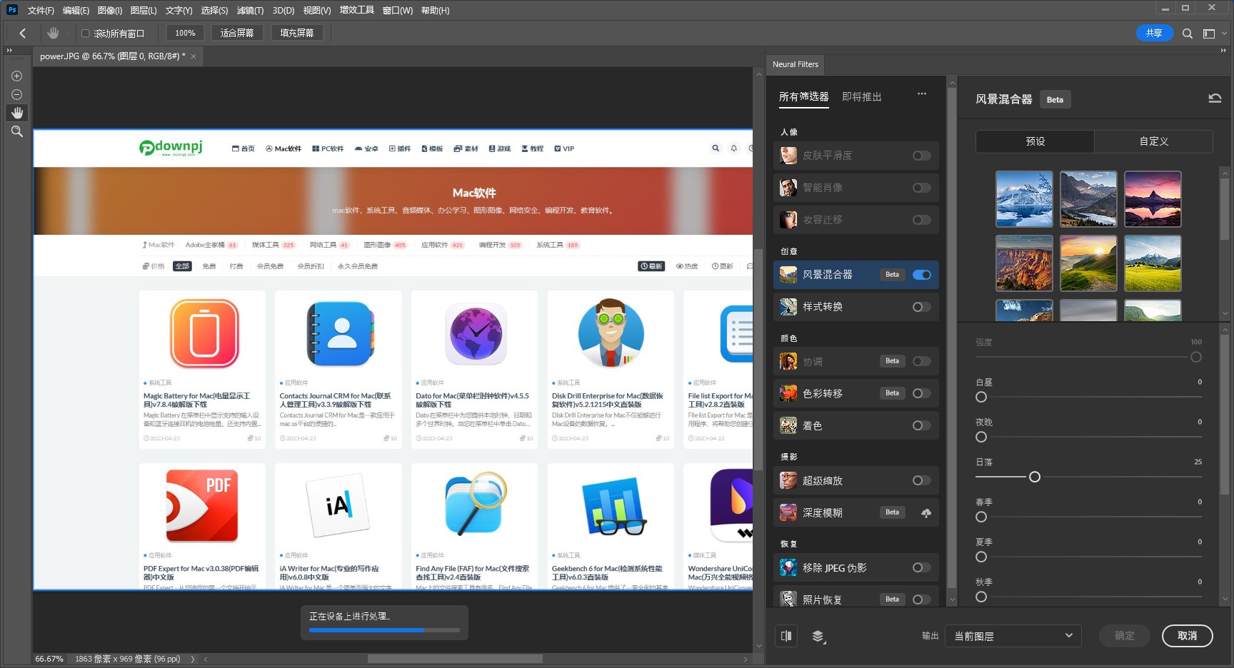 导航至文件 > Neural Filters > 所有滤镜。选择 Beta 部分下照片恢复的下载云 () 图标以启动下载,然后启用该滤镜。