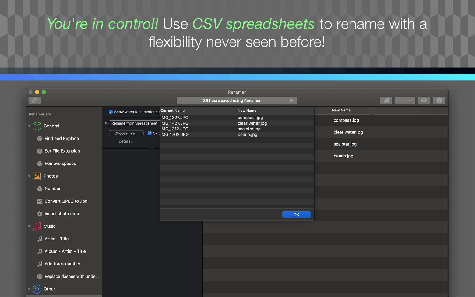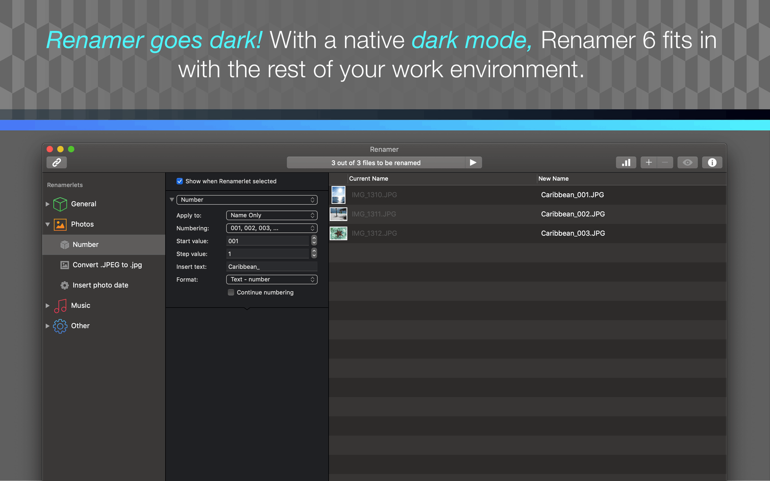 如果您不得不手动重命名成百上千个文件,并且认为“一定有一种更简便的方法”,那么Renamer就是您的理想之选。使用Renamer,您只需按一下按钮,就可以节省数小时的繁琐打字。